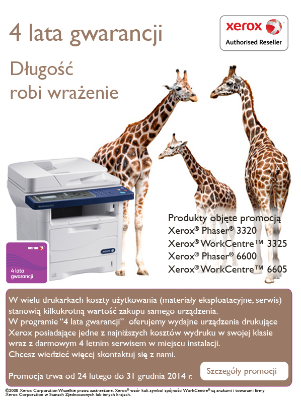 W specjalnej promocji wybrane* drukarki oraz urządzenia wielofunkcyjne Xerox formatu A4 oznaczone promocyjną naklejką „4lata gwarancji” oraz zakupione w okresie od 24 lutego do 31 grudnia posiadają 4 letnią gwarancję.
